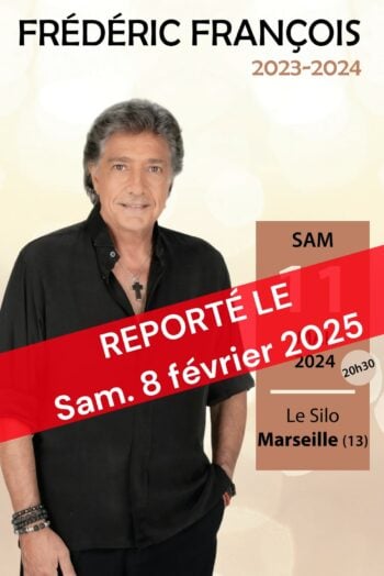 « Suite à un contretemps, nous sommes au regret de devoir reporter la date de Frédéric François, prévue initialement le samedi 11 mai 2024 à Marseille.Ce spectacle aura lieu le samedi 8 février 2025.